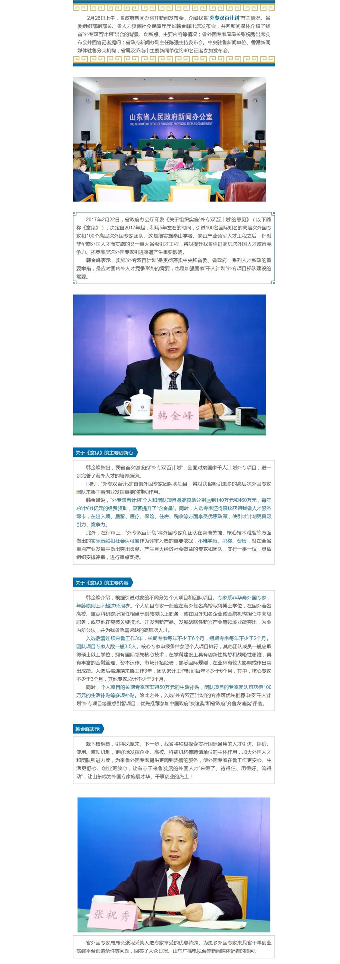 韩金峰厅长通过新闻发布会介绍我省“外专双百计划”出台的背景、创新点、主要内容等情况